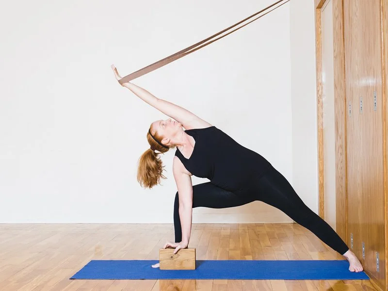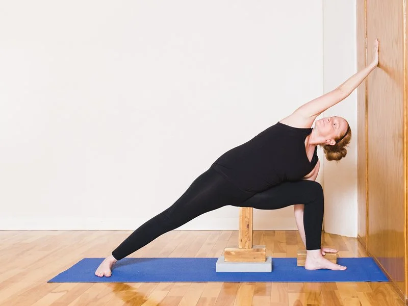 Variation 1 – Building up blocks to find the 90° angle in the bent leg teaches the body to know where 90° is and creates the ideal angle in this pose. The blocks are placed under the very top of the femur bone of the front leg near the sit bone which helps to understand the grounding action of the top femur of the front leg moving from the top of the femur down into the blocks and away from the hip bone. The hand in the wall teaches extension of the side torso from the outer edge of the back foot right to the fingertips in to the wall.